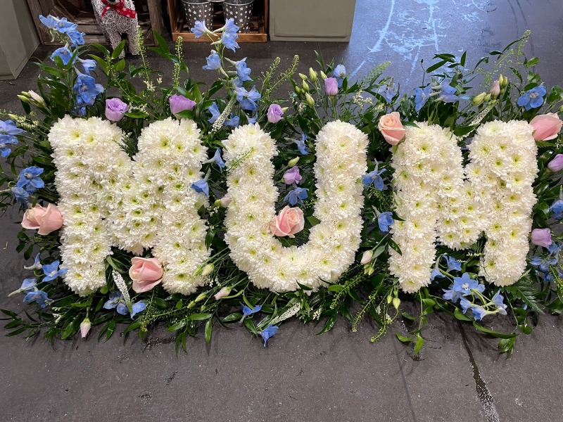 Letters based in white chrysanths. Please choose the colour of the flower surround.